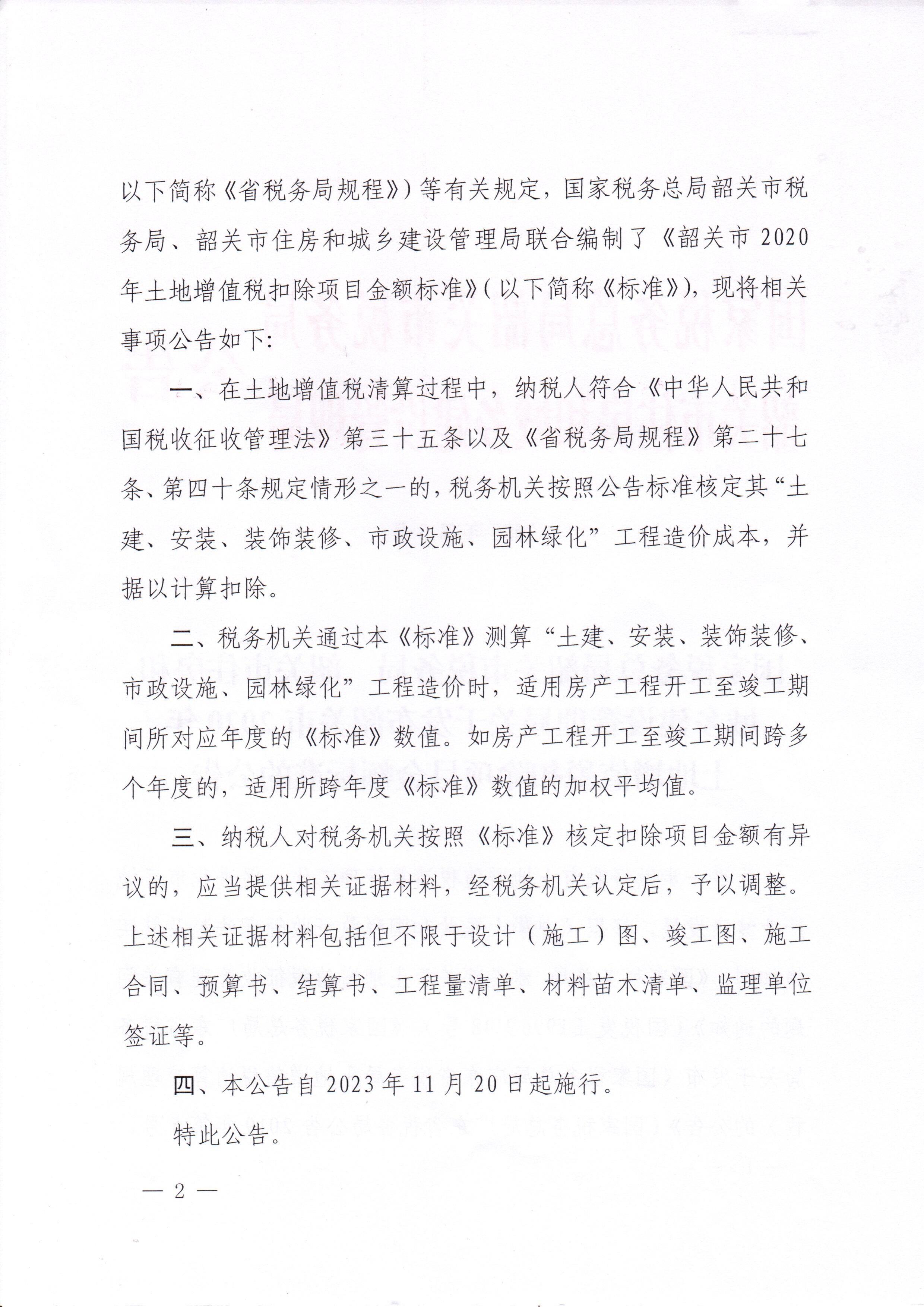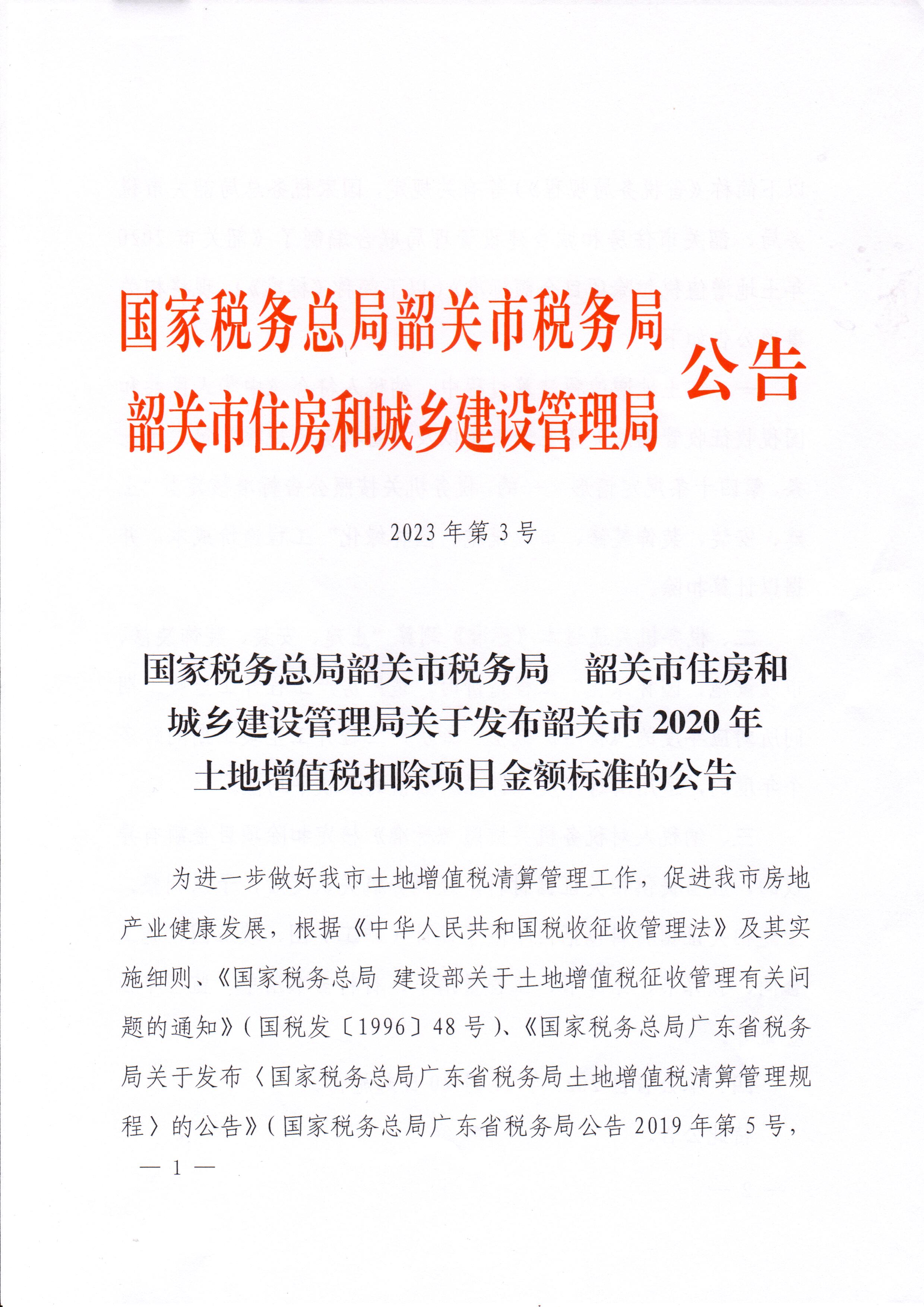 关于发布韶关市2020年土地增值税扣除项目金额标准的公告