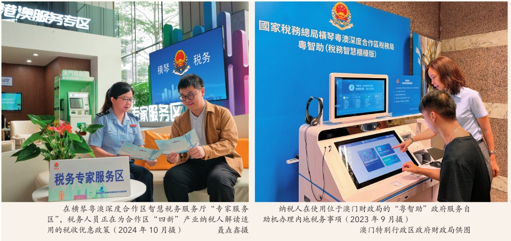 找准战略定位,倾力支持澳门经济多元发展。落稳落好国家赋予的区域性税惠政策。扎实推进横琴“双15%”所得税、“澳人澳税”等区域性税收支持政策全面落地,企业享惠户数人数和金额双增长;搭建港澳居民税收优惠直达快享“规则转换桥”,有力推动两地税负趋同,政策效应不断释放。2020~2023年,合作区GDP年均增长5.1%,目前合作区经营主体超5.8万户,其中澳资企业超6500户,较《横琴方案》发布以前增长超4成。助力澳门产业拓展发展势能。牵头出台实质性运营标准引导澳门元素注入横琴,助推横琴“四新”产业更好对接澳门“1+4”经济适度多元发展策略。截至2024年第三季度,横琴“四新”企业数超1.7万户,较2021年合作区成立当年增长20.1%,横琴澳资企业实现税收保持同步较快增长。推动各类要素跨境便捷流动。高效落实横琴分线管理涉税政策,完善征管信息化系统调整及智能化监管等配套,促进粤澳间乃至国际的人流、物流、资金流、信息流等关键生产要素的流动更加高效便捷,政策效应稳步释放。