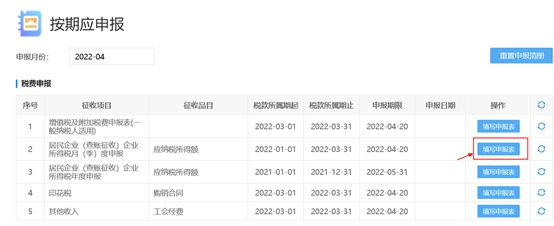 第二步:进入“按期应申报”模块,选择当期应申报的项目,点击“填写申报表”: