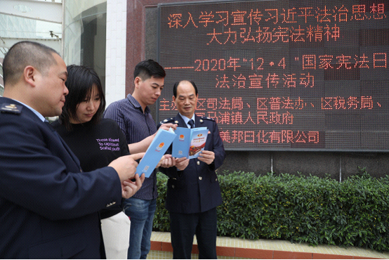 在第七个“国家宪法日”即将到来之际,汕头市潮南区税务局与潮南区委宣传部、司法局、普法办等多部门联合举办了以“深入学习宣传习近平法治思想 大力弘扬宪法精神”为主题的宪法进企业宣传活动,挑选了以“广东美邦日化有限公司”(简称“美邦日化”)为代表的一批企业开展法治宣传,提供法治主题教育、法律咨询等服务,引导企业依法经营,推动法治文化建设,全面拉开2020年宪法宣传周的序幕。