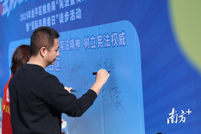 在徒步活动起点,税务人员与社区居民共同在“加强宪法学习、增强宪法意识、弘扬宪法精神、树立宪法权威”的签名墙上庄重签名,共同倡议学深悟透习近平法治思想、大力弘扬社会主义法治精神,让宪法信仰入脑入心,将宪法实践融入到日常行动中。