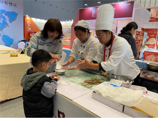 在综合馆,“潮菜出海成果展”让大家大开眼界,潮汕菜大师现场亲授潮汕家常菜烹饪诀窍干货满满。面塑、粿品点心展示及DIY体验区里,家长、孩子全方位沉浸式参与体验,感受传统潮汕美食文化的独特魅力。市民黄女士便是其中之一。她带着孙子在工作人员的指导下学习制作“鸭母捻”,孩子借此机会认识了这道潮汕传统美食,祖孙俩非常开心。
