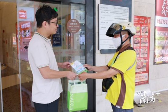 外卖小哥将税惠“幸福餐”配送到纳税人缴费人手中。