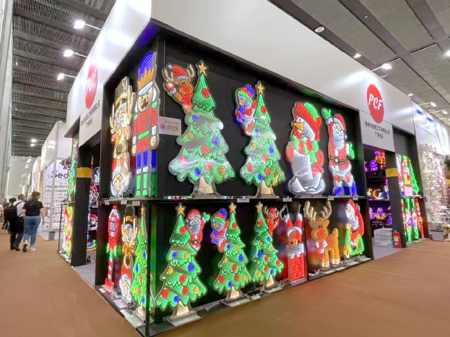 装饰精美的圣诞树、憨态可掬的雪人玩偶、笑容可亲的圣诞老人……在陆丰市怡雅工艺品有限公司的展位,圣诞节氛围十足,五光十色的节日灯饰让人眼花缭乱,在全屋黑色背景的衬托下充满酷炫感和时尚感。