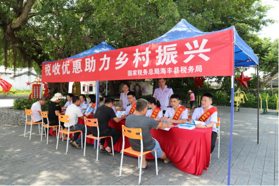 近日,海丰县税务局“乡村振兴红色税宣队”走进海丰县附城镇新山村委开展“税收优惠助力乡村振兴”税宣活动,推行“税村共建”,将“一站式”服务延伸到村。