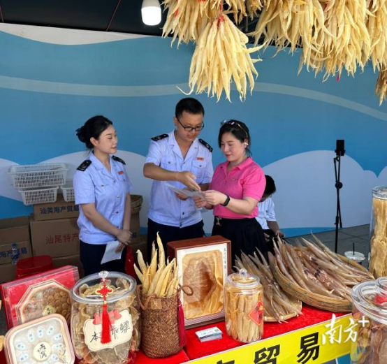 “这是我们热销的鱼胶、元贝海鲜干货产品,这次海鲜干货集市接到了很多订单,发票需求量也增加了,税务人员现场辅导我们办理发票额度调整、开具发票,真是让我们省心不少。”汕美海产贸易摊位经营者林女士说。