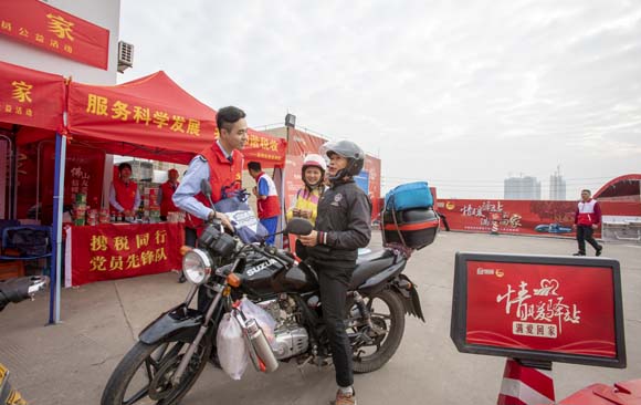 春运期间,国家税务总局佛山市高明区税务局组织志愿者到服务站点,为返乡“摩托大军”提供志愿服务。图为志愿者向骑摩托返乡的务工人员派发爱心大礼包。