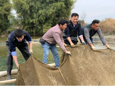英德市沙口社区的水产专业合作社迎来鱼塘养殖大丰收,丘成炽(右二)与党员先锋志愿队员正在收网捕鱼