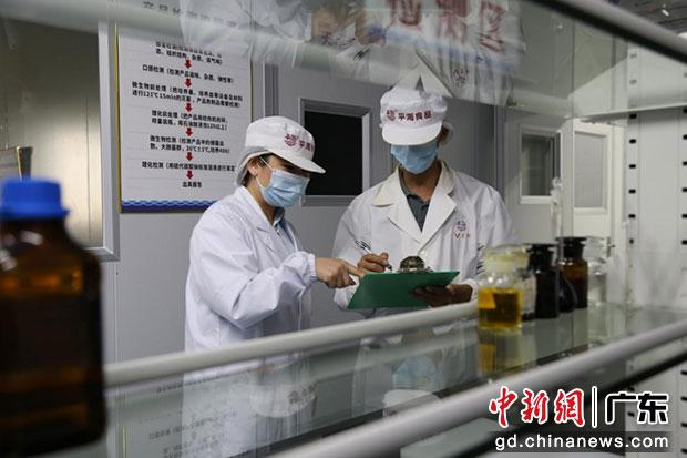 图为黄昭鸿(左)在实验室了解产品信息。黄贤诗 摄