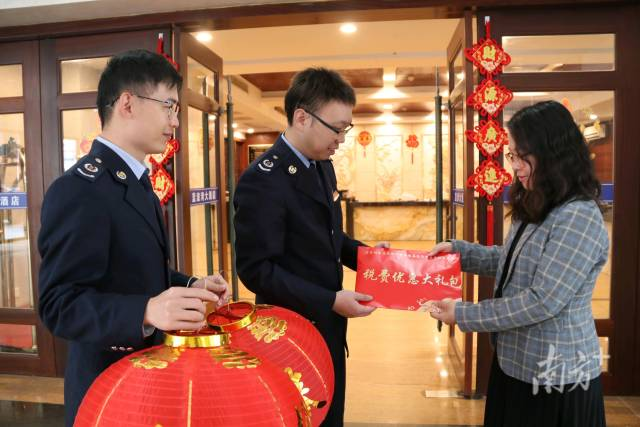 猜灯谜活动结束后,税务干部还积极走访辖区内企业,解答相关涉税疑问,并送上精心制作的税费优惠大礼包与税宣灯笼,礼包内含有2023年最新出台的小规模纳税人优惠政策、“非接触式”办税操作指南等,在传统节日氛围中点亮“税惠之灯”。