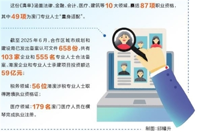 截至2025年6月,合作区城市规划和建设局已发出备案认可文件658份,共有103家企业和555名专业人士合法备案,港澳企业和专业人士承建项目投资额达59亿元;税务领域,56位港澳涉税专业人士取得跨境执业资格证;医疗领域,179名澳门医疗人员在横琴完成执业注册,多领域跨境执业便利化成效显著。