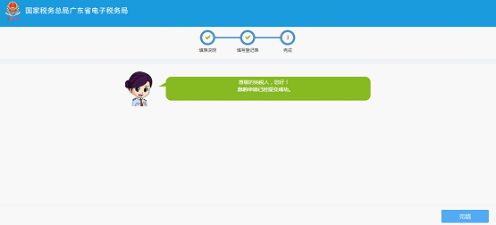 5.信息填写完成后,点击“提交”,当系统出现提交成功页面,即表示提交成功。点击“完结”,可以关闭提交界面。