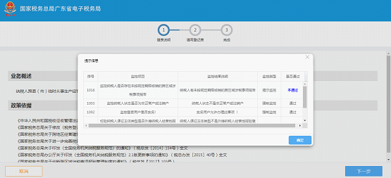 3.进入【跨区域涉税事项报告】界面后,弹出监控信息。强制监控不通过,无法继续办理业务;提示监控无论是否通过,均允许继续办理业务。