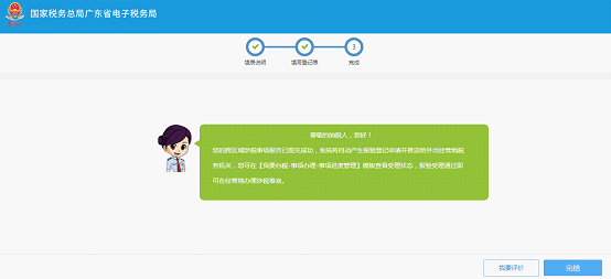 7.纳税人确认无误,点击“提交”,当系统出现提交成功页面,即表示提交成功。本界面可以通过点击“我要评价”,对本次操作体验予以评价。点击“完结”,可以关闭提交界面。