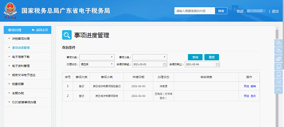 8.纳税人可以选择【事项办理—事项进度管理】,打开事项进度管理界面,查询申请的跨区域涉税事项报告并签收。
