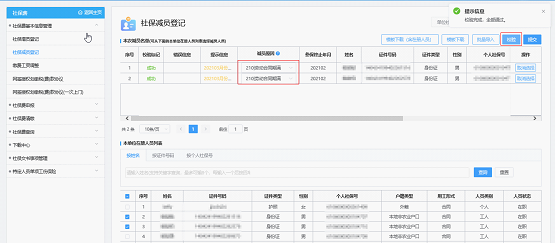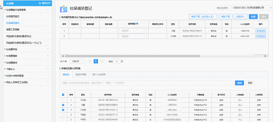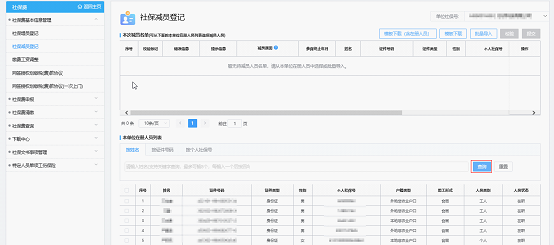 b) 点击【查询】按钮可显示本单位所有在册人员明细信息;也可通过查询条件按“姓名”、“证件号码”、“个人社保号”进行精确查询本单位在册人员信息;