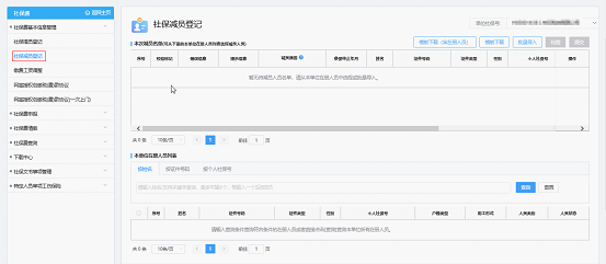 a) 点击菜单【社保减员登记】模块功能,进入社保减员登记界面;点击【模板下载(含在册人员)】按钮下载含本单位的在册人员信息文件到本地,删除无需减员的数据,保留需减员人员;或者点击【模板下载】按钮下载空模板,录入需减员人员信息;