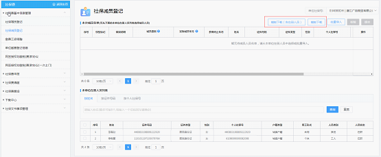 【本次减员名单】:在【本单位在册人员列表】栏勾选需要减员人员,勾选后在【本次减员名单】栏显示待减员名单;或通过【批量导入】减员文件后,在【本次减员名单】栏显示导入的待减员名单;