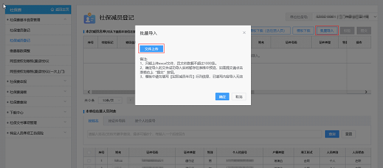 b) 点击【批量导入】按钮,选择已经编辑好的减员模板文件上传;