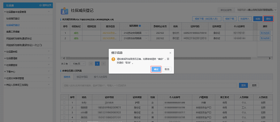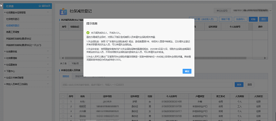 d) 校验成功后,点击【提交】弹出“提交确认”对话窗口,点击【确定】,弹出“减员成功”窗口,则为减员成功,同时在本单位在册人员减掉提交人员;