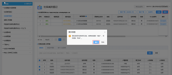 【取消选择】:从【本次减员名单】列表移除减员人员,同时取消在【本单位在册人员】的人员勾选;