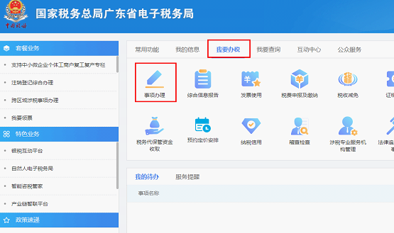 1.登录广东省电子税务局,点击【我要办税】--【事项办理】
