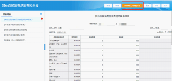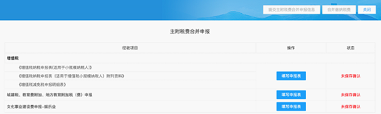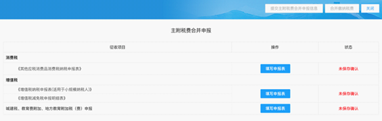 4.进入“主附税费合并申报”界面,若您为消费税纳税人,则需要先填写消费税申报表,保存确认后再填写增值税等其他申报表