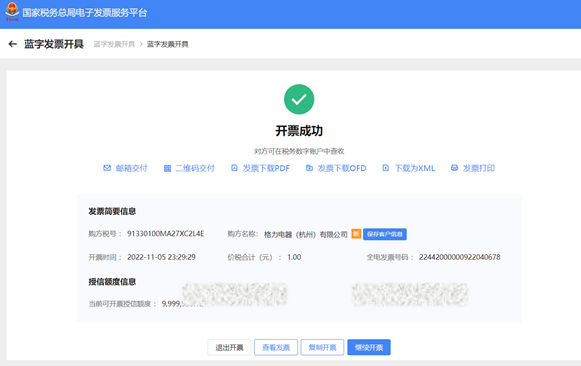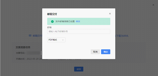 设置好发件邮箱之后,点击【邮箱交付】,输入接收方邮箱账号,选择交付格式,点击【确定】即可将发票发送到接收方邮箱,完成邮箱交付。