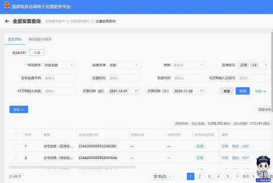 开票方和受票方均可通过税务数字账户查询开具和接收的发票。进入路径:广东省电子税务局——【我要办税】——【税务数字账户】——【发票查询统计】——【全量发票查询】