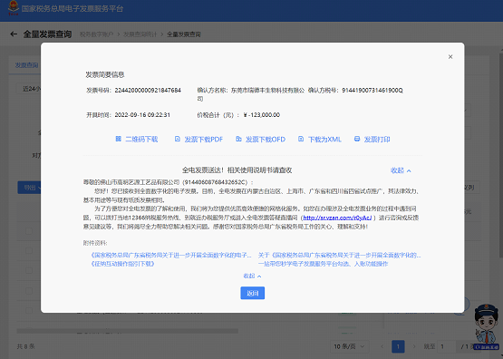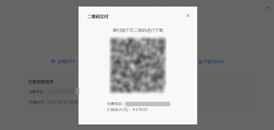 点击【下载】按钮,可进行“二维码下载”、“发票下载PDF”、“发票下载OFD”、“下载为XML”“发票打印”操作,同时,系统为您推送“数字化电子发票使用说明书”及相关资料链接。