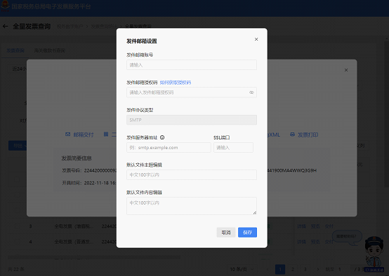 选择邮箱交付需要维护发件方邮箱信息,若未维护,点击【邮箱交付】将显示维护发件邮箱界面,也可以直接在【税务数字账户】-【发件邮箱设置】设置发件邮箱信息。
