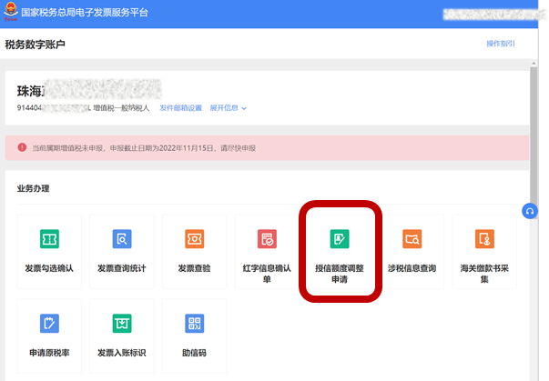 进入路径:广东省电子税务局——【我要办税】——【税务数字账户】——【授信额度调整申请】