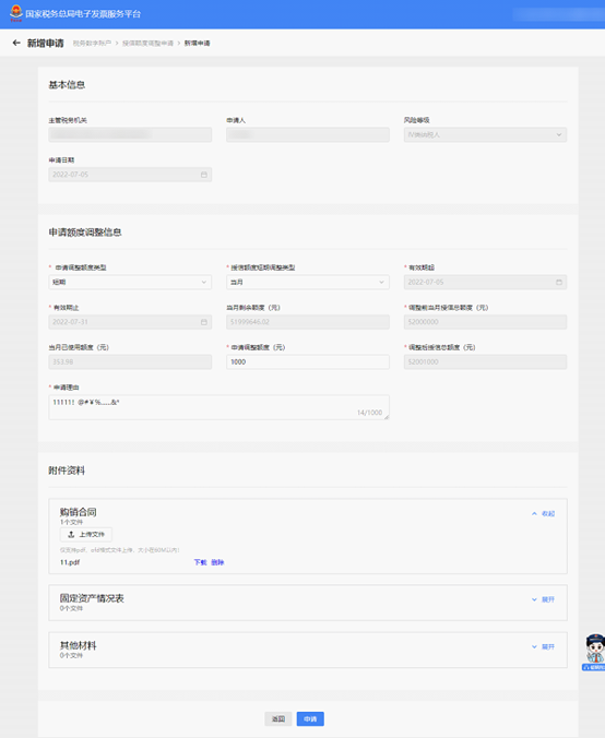 授信额度调整申请是当现有额度不足,且系统自动发起的动态授信无法满足求时,纳税人经实人验证后,可以通过补充提供购销合同、固定资产清单及其他材料,向税务机关申请调整授信额度。