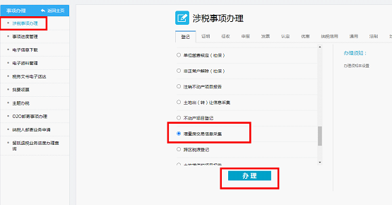 3.点击【涉税事项办理】-【增量房交易信息采集】-【办理】