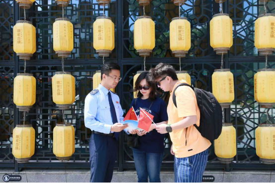 (税务人员向唐家古镇游客宣传税收政策和古镇文旅项目)