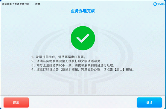 5. 打印成功后,进入“业务办理完成”界面。纳税人若需要继续办理,则点击【继续】按钮,系统将返回到功能主界面;若不需要继续办理,则点击【退出】按钮,系统将返回到系统主界面。如下图所示: