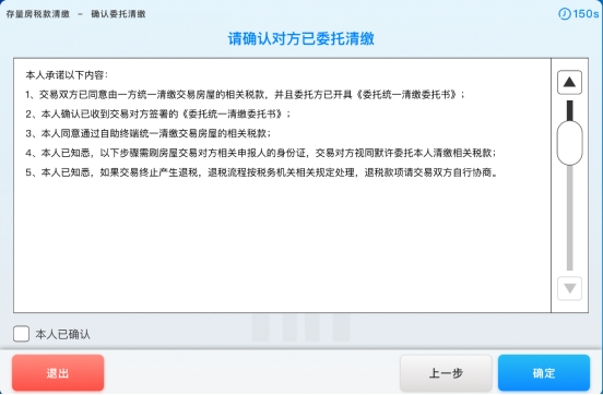 5. 若纳税人选择【统一清缴】方式,则弹出“交易对方委托清缴”确认界面,纳税人确认信息无误并勾选同意,然后点击【确定】按钮,如下图所示: