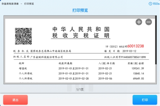 9. 缴款成功后,系统进入“完税证明预览”打印界面,纳税人确认完税证明信息,点击【打印】按钮,如下图所示: