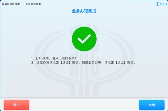 10. 打印成功后,系统进入“业务办理完成”界面,纳税人若需要继续办理,则点击【继续】按钮;若不需要继续办理,则点击【退出】按钮,返回自助终端机系统主界面,如下图所示: