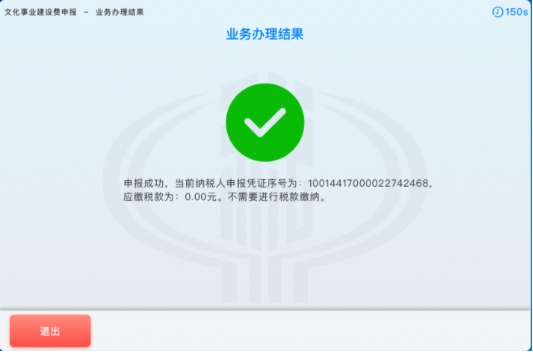 6. 若为免税申报,则无需进行缴费。申报成功后,进入“业务办理完成”界面。纳税人点击【退出】按钮,返回自助终端机系统主界面,如下图所示: