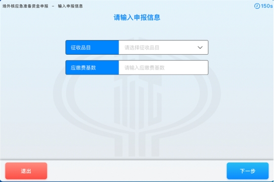 1. 纳税人在自助终端机系统主界面,选择“场外核应急准备资金申报”功能。