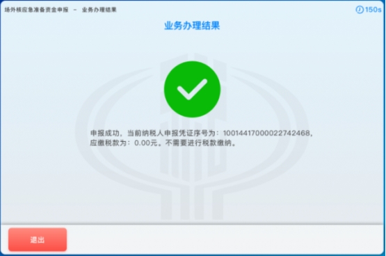 6. 若为免税申报,则无需进行缴费。申报成功后,进入“业务办理完成”界面。纳税人点击【退出】按钮,返回自助终端机系统主界面,如下图所示: