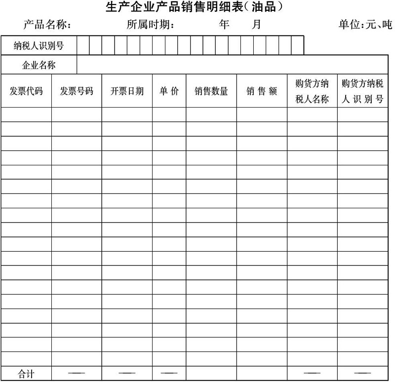 2.本表用于填报纳税人在申报所属期内在国内销售的所有油品的发票明细,不同产品的发票明细应分不同的明细表分别填列。