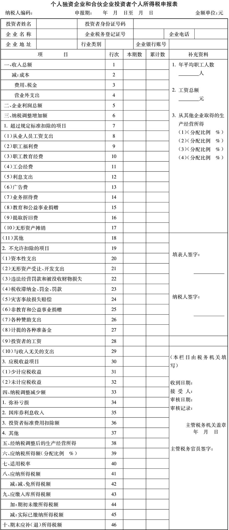 (一)本表适用于个人独资企业和合伙企业投资者年度申报纳税及月、季度申报纳税。本着求实、简便的原则,在月、季度申报纳税时,可对本表有关项目进行精简,具体由各地税务机关根据实际情况确定。