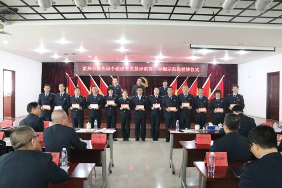会上由党委书记、局长邱国曼同志作动员讲话,对党、团、群组织工作和今后党员先锋队、青年突击队、党员示范岗、巾帼示范岗发挥党员、青年、职工、妇女在个税改革中的先锋突击作用提出了希望,指明了方向。随后,党员先锋队代表陈江腾、青年突击队代表薄纯洁、党员示范岗代表张瑞安、巾帼示范岗代表梁彩婵等四位同志分别作了表态发言,党委书记邱国曼、副书记孔建辉、雷州市直属工委张文状书记对李坚强、梁彩婵等25位同志进行授旗授牌。