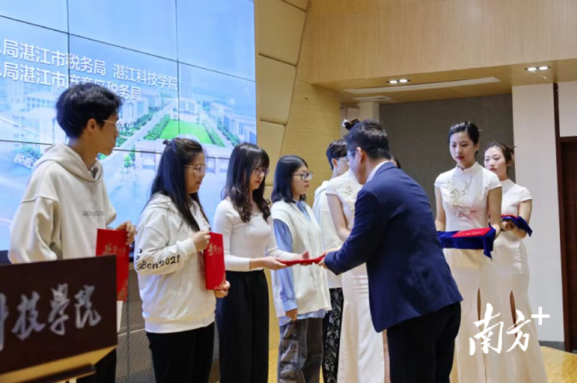 湛江科技学院党委书记梁朝辉为税收普法大学生志愿者颁发证书。
