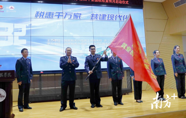 活动现场还举行了“湛江市创业就业志愿服务队”授旗仪式,为高校税收普法大学生志愿者颁发证书,同时税务部门开展“税收优惠政策助力大学生创业就业”主题宣讲,普及创业就业税费优惠政策、社保等相关税费知识。