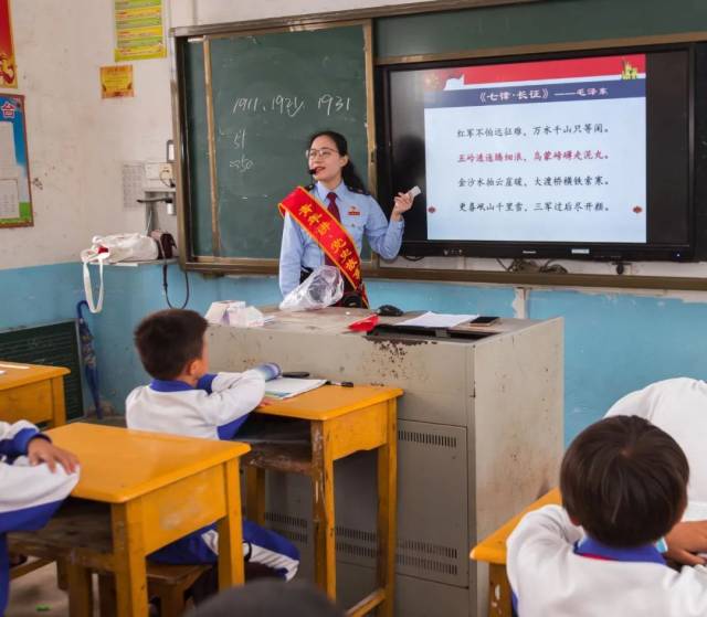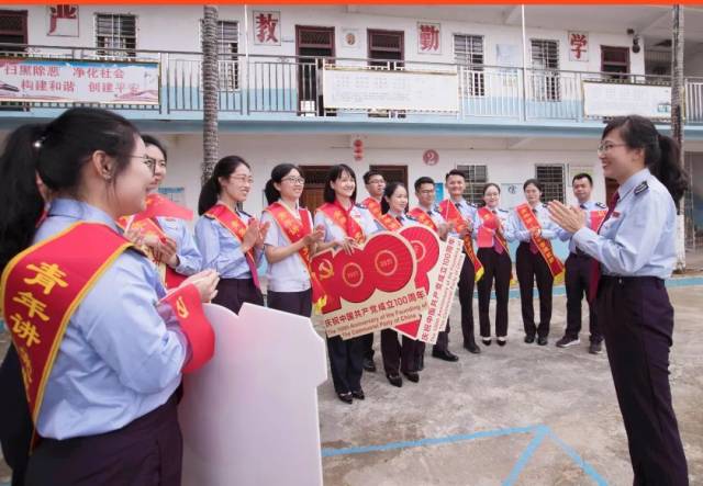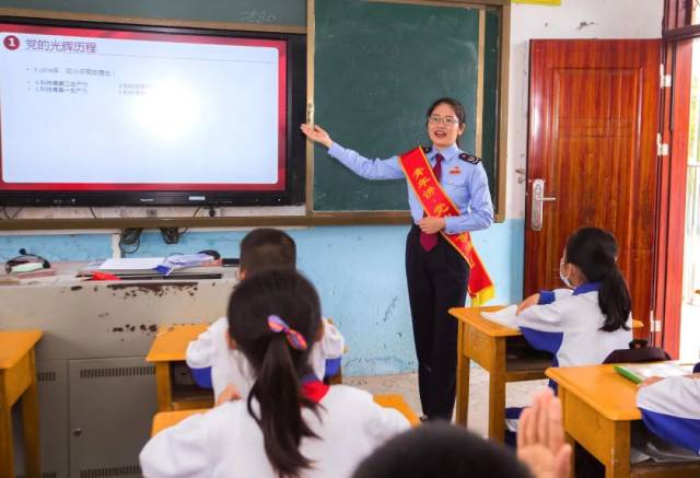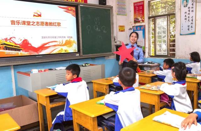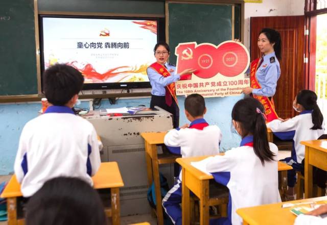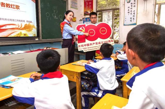 开展生动有趣的知识问答,解读建党100周年庆祝活动标识的构建和寓意;深情诵读脍炙人口毛泽东诗词《七律·长征》,在朗朗书声中体验红军长征的伟大壮举;随着动听的吉他伴奏,一起学唱《让我荡起双桨》,在孩子们的心田播洒热爱生活、奋进前进的种子……近日,湛江市税务局机关青年党员一行18人,走进雷州市松竹镇山尾小学开展“青年讲•党史故事进校园”活动,通过课堂授课、有奖问答、视频展播、游戏互动等,为全校近240名学生带来了一堂生动的党史教育课,用最朴实无华的方式传承红色薪火,用最真挚的情感表达对中国共产党的敬仰,让爱党、爱国的情怀在娃娃们的心灵中生根发芽。