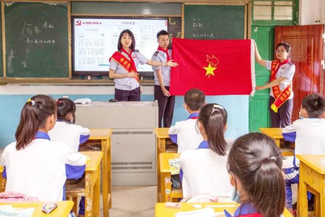 青年党员谢虹(左)向孩子们讲解中国少年先锋队队旗和队徽的寓意,教育大家从小就要听党话、跟党走,做一个不怕困难、奋发有为的好少年。