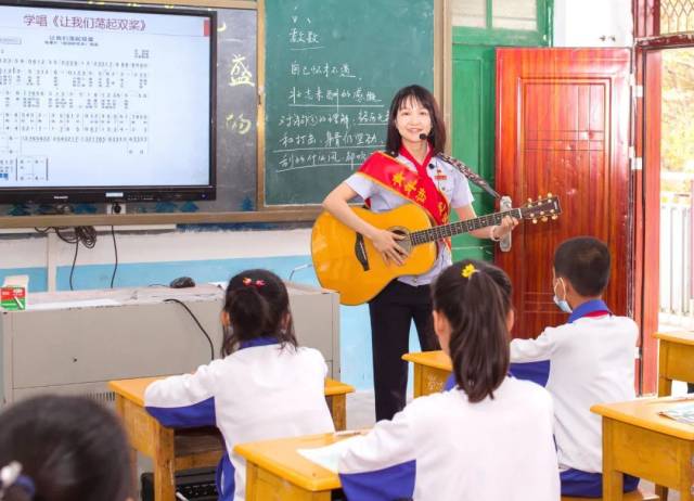 “让我们荡起双桨,小船儿推开波浪,海面倒映着美丽的白塔,四周环绕着绿树红墙……”青年党员谢虹弹着吉他教同学们学唱经典红歌,启迪孩子们珍惜今天来之不易的幸福生活,永远听党话、跟党走。